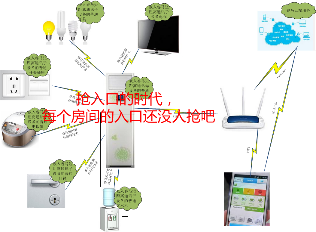 在普通空调中融入睿马信息科技独有的短距离无线自动组网技术让传统空调以母设备的身份立马升级为每个房间的智慧控制中心。每个房间中的其他设备都以短距离通讯子设备的形式接入空调,手机通过空调不但能控制空调本身,还能通过空调控制房间中的其他智能设备。
